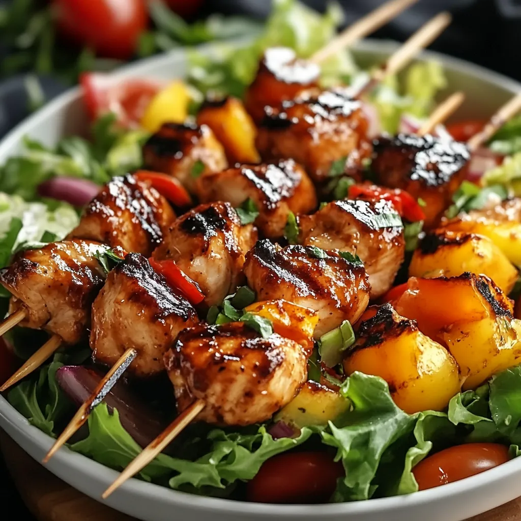This refreshing salad combines juicy, smoky BBQ-glazed chicken skewers with crisp summer vegetables and a zesty honey-apple cider vinaigrette. It’s a satisfying and light main course perfect for grilling season.