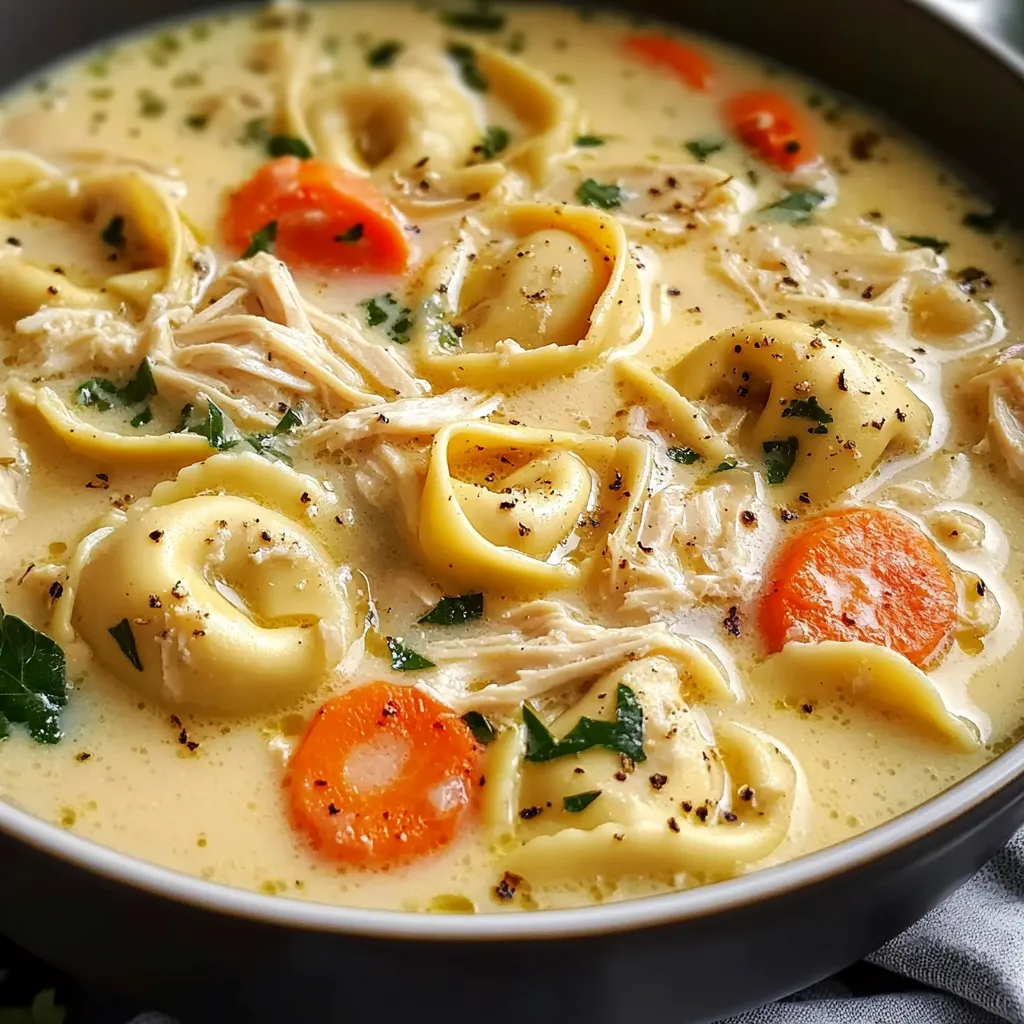 This one-pot soup is a comforting, hearty meal combining tender shredded chicken, cheese tortellini, and aromatic vegetables in a velvety, creamy broth. It’s an easy and deeply satisfying family dinner.Ingredients