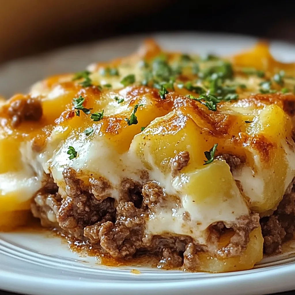 Storage: Store leftovers in airtight containers in the fridge for up to 3-4 days. Reheating: Microwave individual portions on medium power for 2-3 minutes, or reheat larger portions covered with foil at 325°F for 20 minutes. Freezing: Wrap tightly and freeze for up to 2 months. Thaw overnight in fridge before reheating. Make-Ahead: Assemble up to 24 hours ahead, cover, and refrigerate. Let sit at room temperature 15 minutes before baking, or add 5-10 minutes to covered baking time. Speed Tip: Par-boil sliced potatoes for 5-8 minutes before assembling to cut final baking time by about 20 minutes. Substitutions: Use ground turkey or chicken for leaner option. Swap cream of mushroom for cream of celery or chicken. Try cheddar-mozzarella blend or Pepper Jack for different flavors. Variations: Layer sliced onions or bell peppers between potatoes and beef. Add crumbled bacon over the beef layer. For lower-fat version, use Greek yogurt thinned with broth instead of soup-milk mixture.