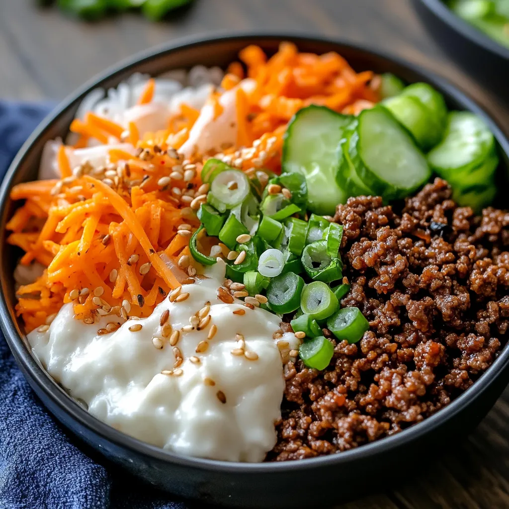 - Divide cooked rice among four bowls. Top each with a generous scoop of Korean ground beef in the center. Arrange sliced cucumbers, shredded carrots, and sautéed spinach around the beef. Sprinkle with sesame seeds and chopped green onions.