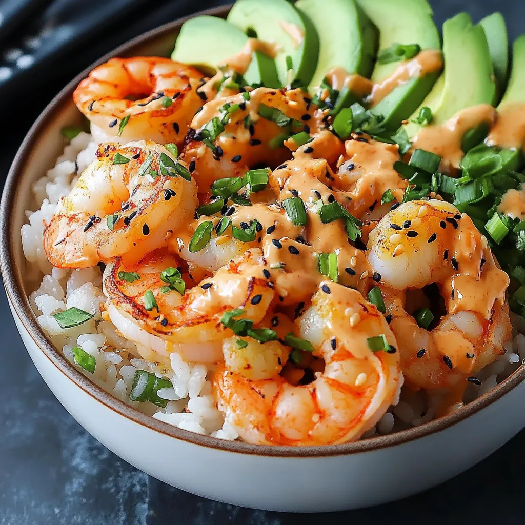 - Divide rice between two bowls. Top with cooked shrimp and sautéed vegetables. Drizzle spicy mayo over the top in a zigzag pattern. Garnish with chopped green onions and sesame seeds. Serve immediately.